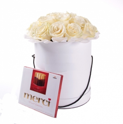 Набор из роз в шляпной коробке и конфет MERCI